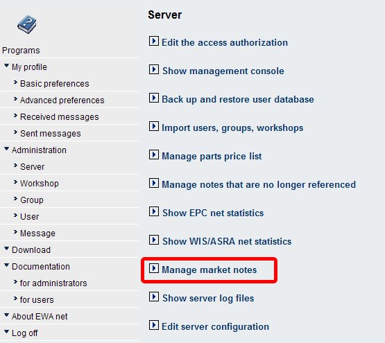 Besides the import for Market Notes it is also possible to edit Market Notes in EPC. Only specia users are able to edit these notes. If you just want to import Market Notes into your EWA system, please take a look to Import of Market Specific Notes chapter.