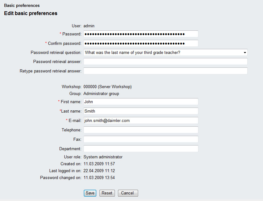 Once you login to the system the first time on a clean and fresh installed system, you can only login as the server administrator - the only user currently known in EWA. You will be asked for a new password for this user. We highly recommend that you immediately after a successful login additionally change the properties of this administrator (like real name, email address,...). You should also modify the Workshop number of the default workshop to the correct one of your physical workshop and might also like to change the name of the default group in the system.