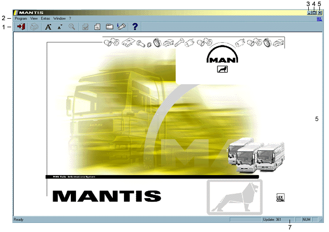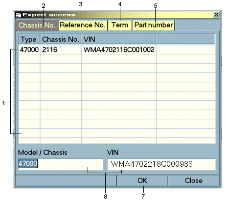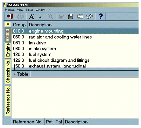 В этом окне для выбранной модели можно выбрать номер шасси из списка (закладка "Chassis No.") и перейти выбору подгрупп и непосредственно рисунку или перейти в группу двигателя (закладка Engine) и продолжить поиск в ней. Последующий переход из группы в подгруппу и далее к рисунку осуществляется двойным щелчком мыши.
