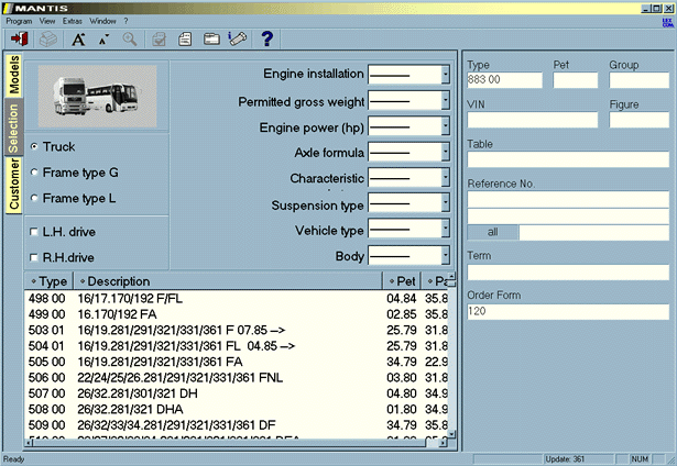 Окно стандартного поиска позволяет искать машину по типу (тягач, автобус, шасси), модели, двигателю.