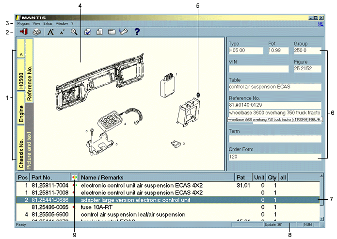 7. Выделенная строка, показывает оригинальный номер и описание для выбранной в окне рисунка детали