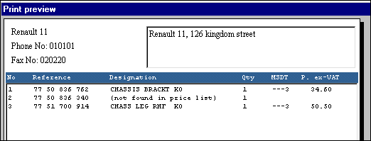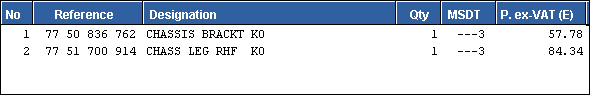 If the part number is included in the price file, DIALOGYS MPF will show the MSDT and the price, excluding VAT.